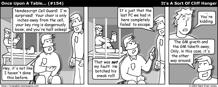 | Here's an example of something I like to do on occasion, which is hide things in the background. Ideally, those "things" would be jokes. The problem is that I've yet to properly get the hang of effective use of space, and so we end up closer to things cowering in the background. Here, the space is used well, but Shirk and his coupon book aren't exactly a joke. There is something else unusual in this strip that would have needed attention had we moved into post production. It's hard to tell in black and white, but Shirk's shoulder belt is on the wrong side. This is because it was necessary to mirror him to keep his head from disappearing behind text bubbles. It also means that Shirk is reading backwards, which gives him quite a headache. | As with 90% of this strip, the police uniforms were a last-minute decision. Often this sort of thing comes out of rummaging around in the prop box or stealing costumes from other productions. In the interest of simplicity (and of Not Getting Caught Stealing Costumes), I simply drew T-shirts with some roughly badge-shaped patch on them. The collars were added to complete the effect, because otherwise it looked like the town of Bob had a bunch of yuppies and their polo shirts policing the town. And that was just frightening. For those of you not in the know, "botched his sneak roll" is slang for throwing up on the cell guard and then slipping on the mess and knocking yourself out cold on the floor. | No, you're right. This panel likely makes no sense. Being forced to explain a joke is generally a sign of a really bad joke, but that's just what I'm going to do. See, Nate is responding to the revelation that Shirk just had in Panel 2. Andrew, being the source of the revelation, is asked for clarification. Okay, I admit it. That's not even a really bad joke. I have given you a strip without a punchline and with a very confusing cliffhanger. I'm a bad person. |